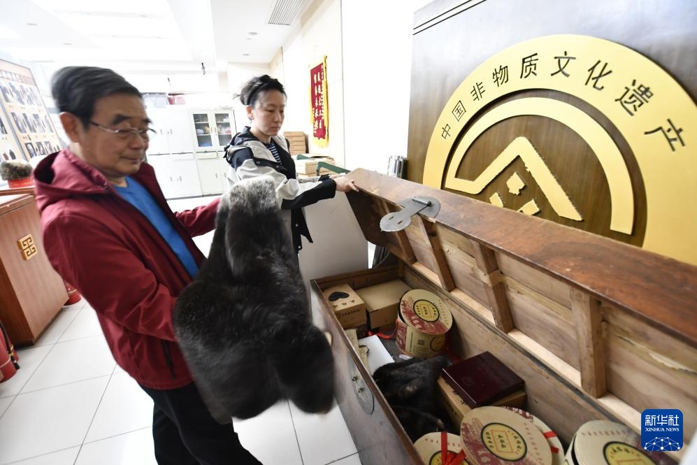 国家级非物质文化遗产盛锡福皮帽制作技艺代表性传承人、全国“五一”劳动奖章获得者李金善(左)从樟木柜内拿取贵重皮帽材料(4月22日摄)。