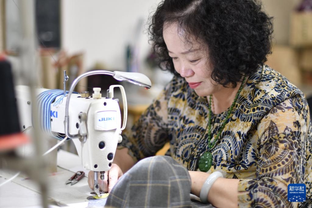 盛锡福皮帽制作技艺传承人马万兰在车间内缝制皮帽的内里(5月4日摄)。