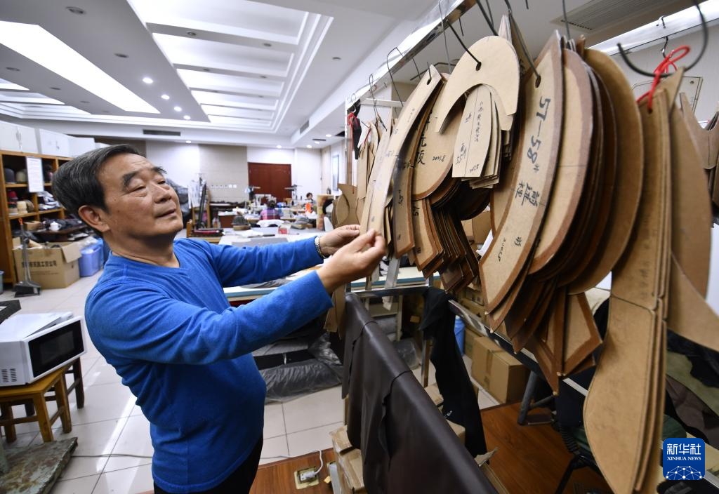 国家级非物质文化遗产盛锡福皮帽制作技艺代表性传承人、全国“五一”劳动奖章获得者李金善在车间内挑选制帽的模板(4月22日摄)。