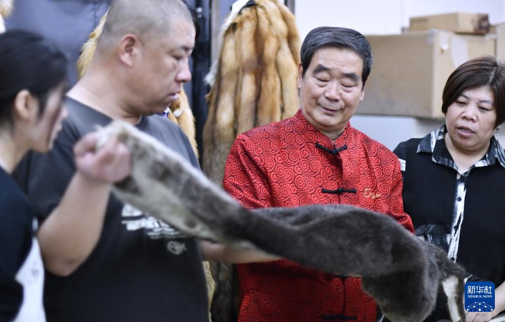 国家级非物质文化遗产盛锡福皮帽制作技艺代表性传承人、全国“五一”劳动奖章获得者李金善在检验成品皮帽的质量(4月22日摄)。