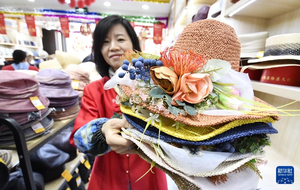 北京王府井商业街的盛锡福帽店内的员工在展示夏季流行的帽子(4月22日摄)。