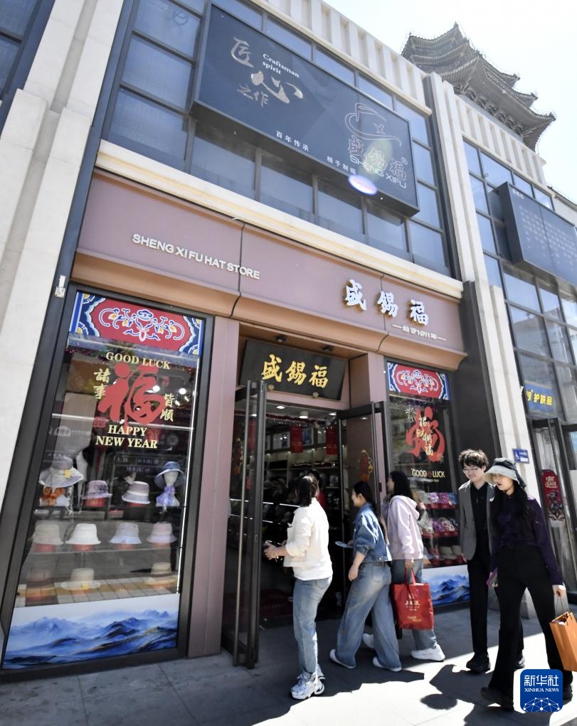 顾客进入位于北京王府井商业街的盛锡福帽店(4月22日摄)。