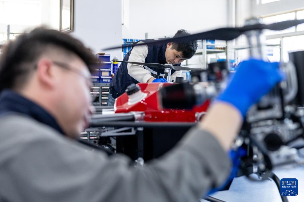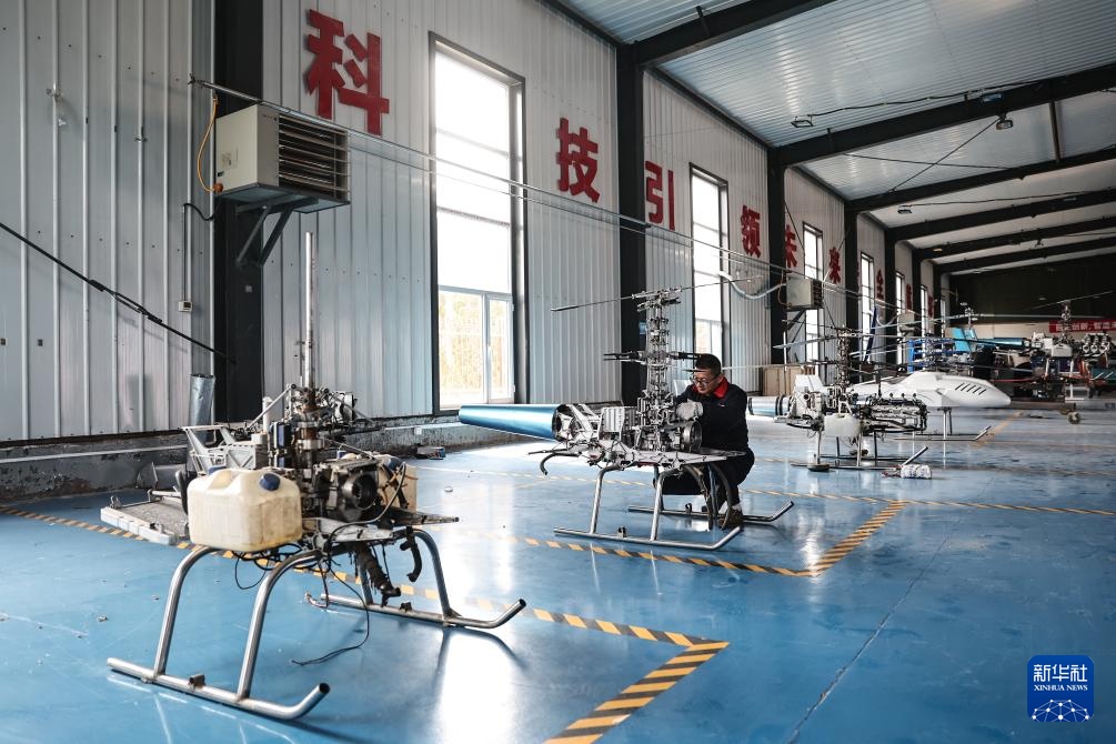 4月25日,在辽宁省沈阳市法库县,工程师在法库中军翼无人机科技有限公司的研发组装车间组装无人直升机。