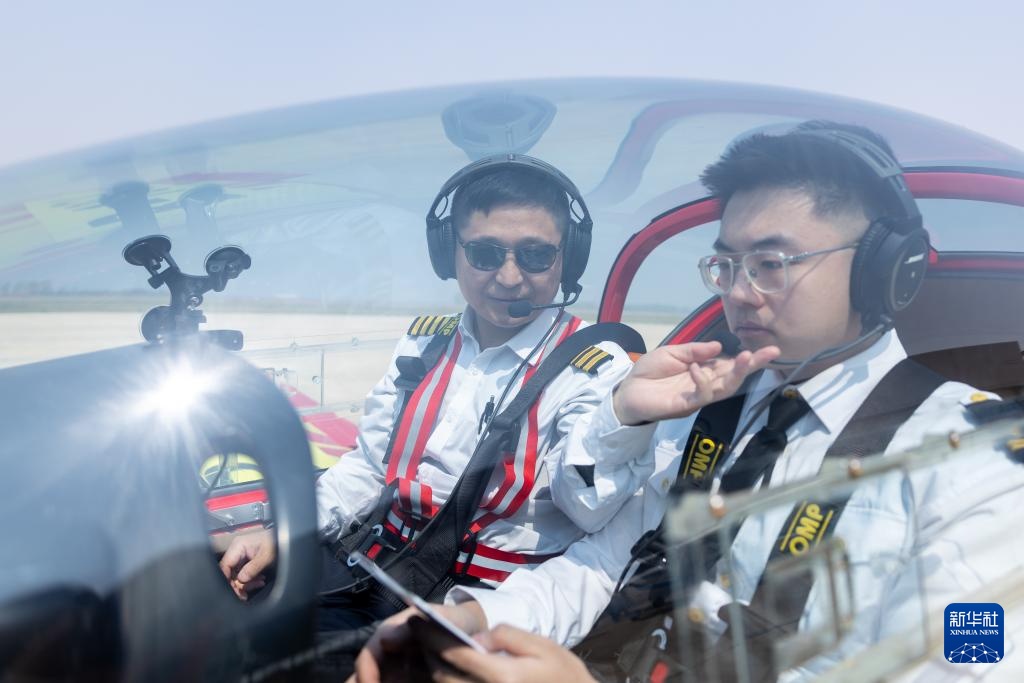 4月26日,在辽宁省沈阳市法库县,学员(右)在辽宁众智益昇航空飞行学院参加轻型运动飞机的飞行培训。