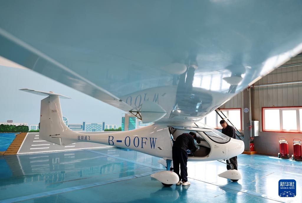 4月25日,在辽宁省沈阳市法库县,工程师在辽宁联航神燕飞机有限公司的生产线做航空器的日常维护。