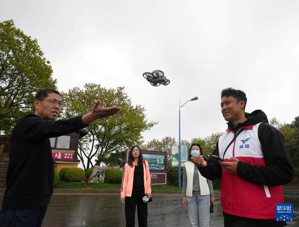 5月9日,在大连童牛岭风景区,辽宁翼隆通用航空有限公司的工作人员(右)帮助游客体验共享无人机。