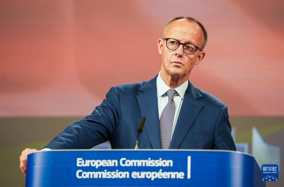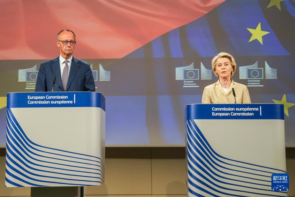 5月9日,在比利时布鲁塞尔,德国总理默茨(左)与欧盟委员会主席冯德莱恩一同出席新闻发布会。