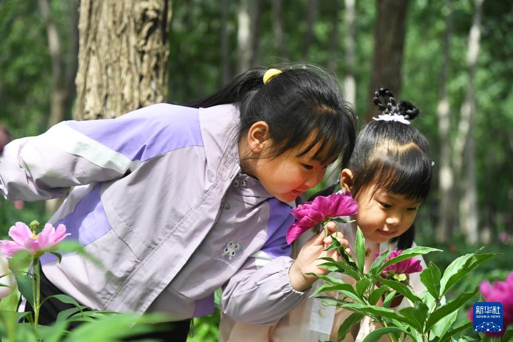 5月10日,小朋友在北京市平谷区东高村镇前台头村芍药花种植基地闻花香。