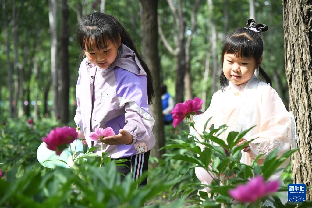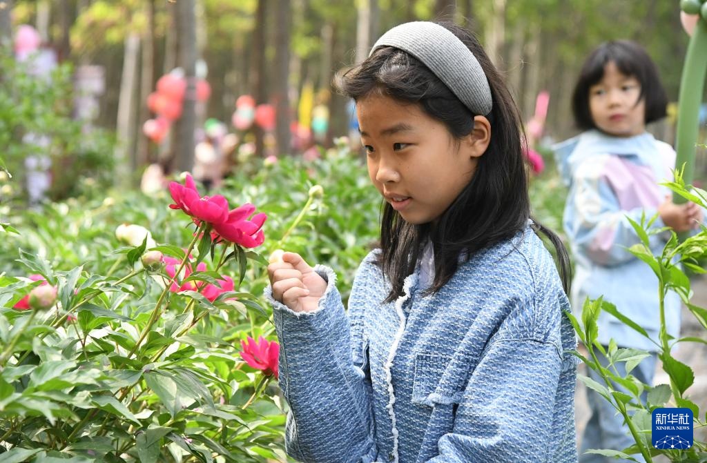 5月10日,小朋友在北京市平谷区东高村镇前台头村芍药花种植基地赏花。