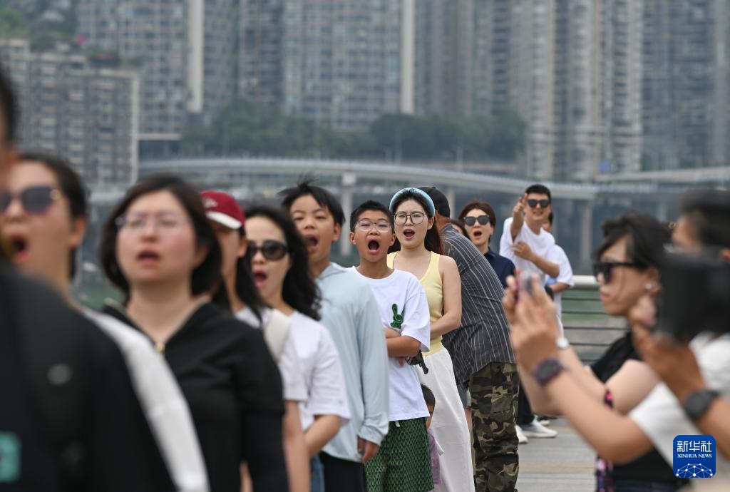 5月4日,在重庆市北滨路,来自各地的游客摆出“吃”轻轨的姿势拍照。