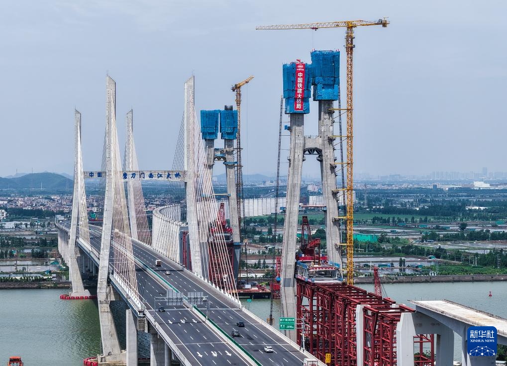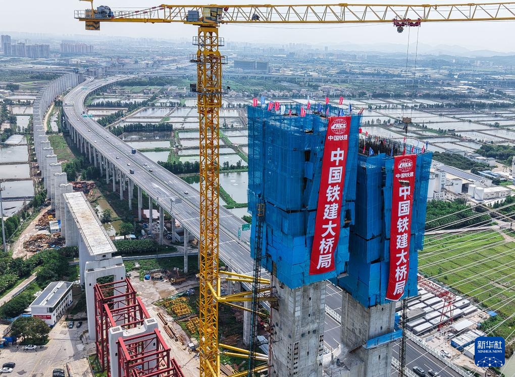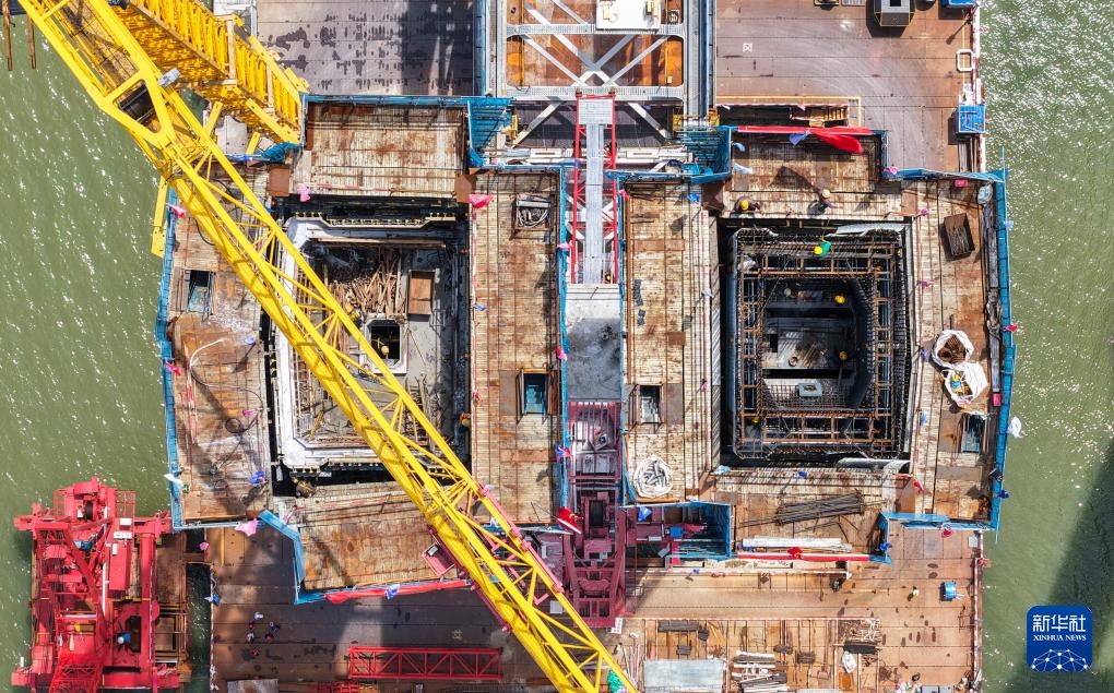 5月11日,深江铁路跨磨刀门水道主桥东主塔封顶(无人机照片)。