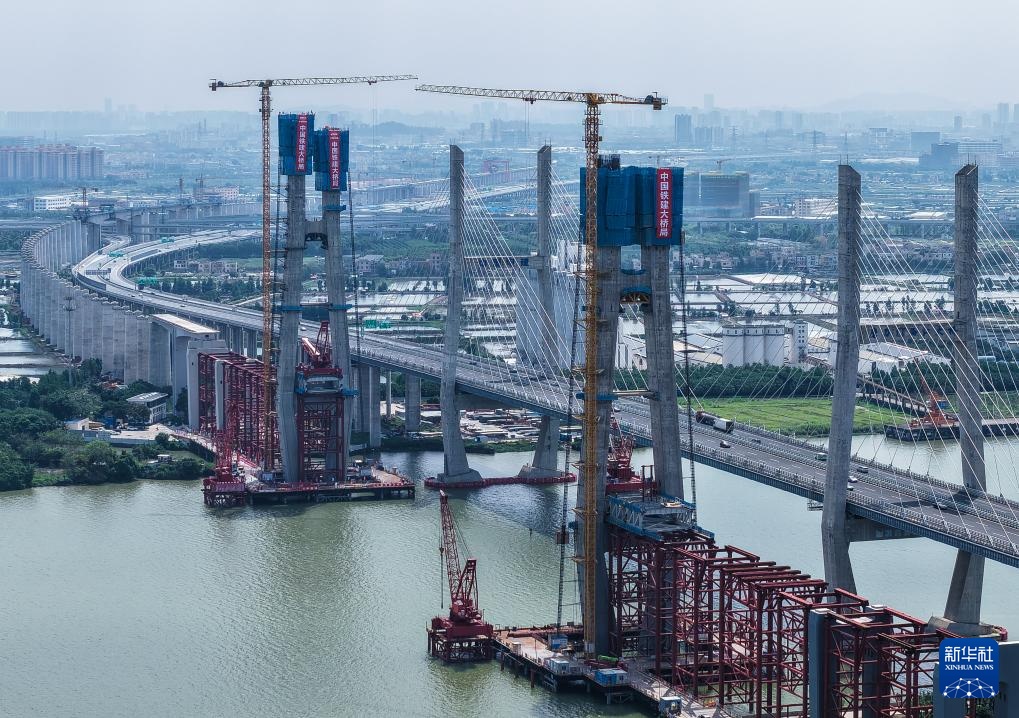 5月11日,深江铁路跨磨刀门水道主桥东主塔(左一)封顶(无人机照片)。