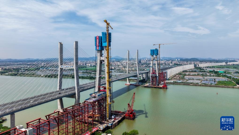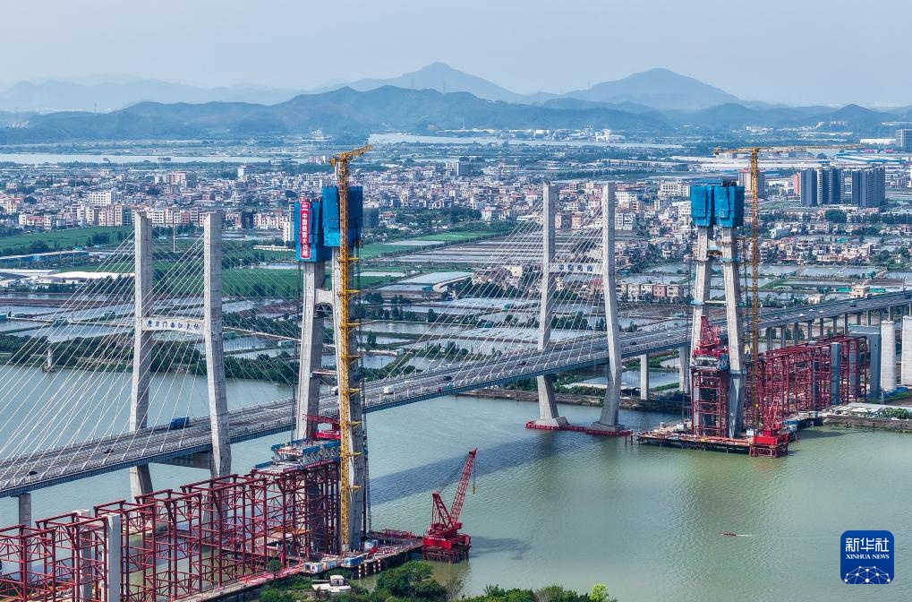 5月11日,深江铁路跨磨刀门水道主桥东主塔(右一)封顶(无人机照片)。