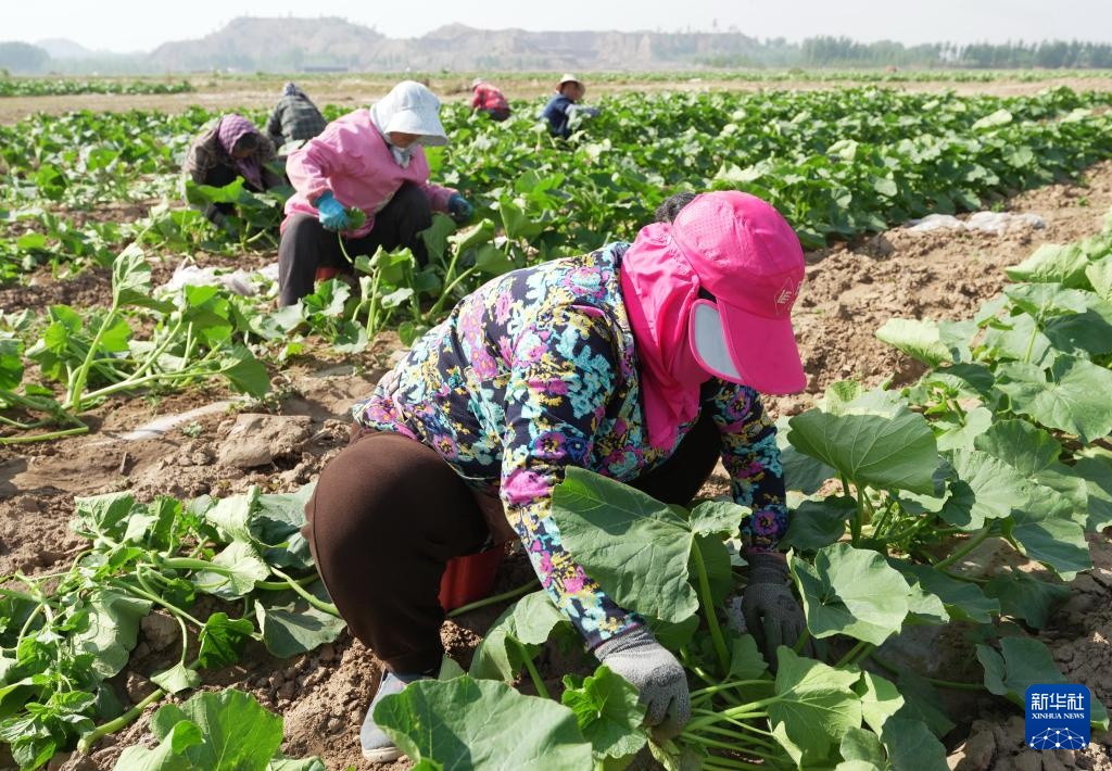 5月11日,河北省卢龙县卢龙镇一家生态农业合作社的社员在田间管护贝贝南瓜秧。