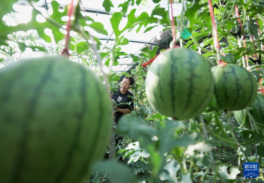 5月11日,河北省卢龙县印庄镇农民在大棚内管护吊蔓西瓜。