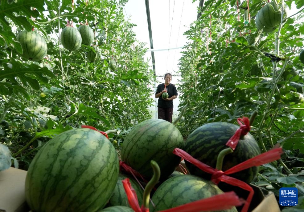 5月11日,河北省卢龙县印庄镇农民在大棚内采摘吊蔓西瓜。