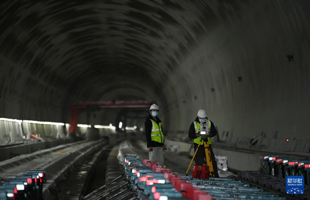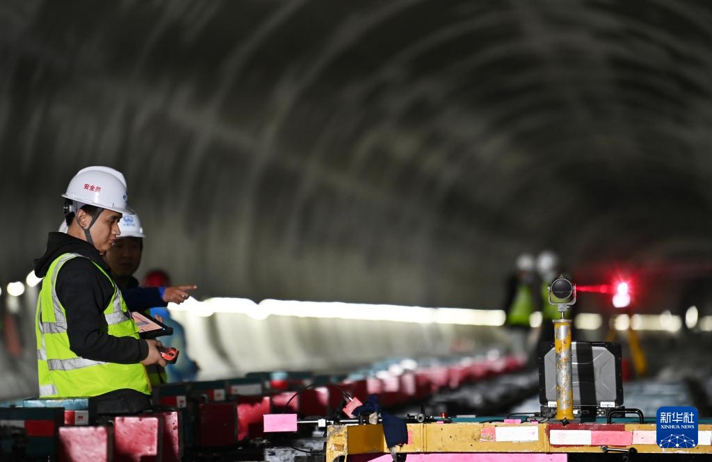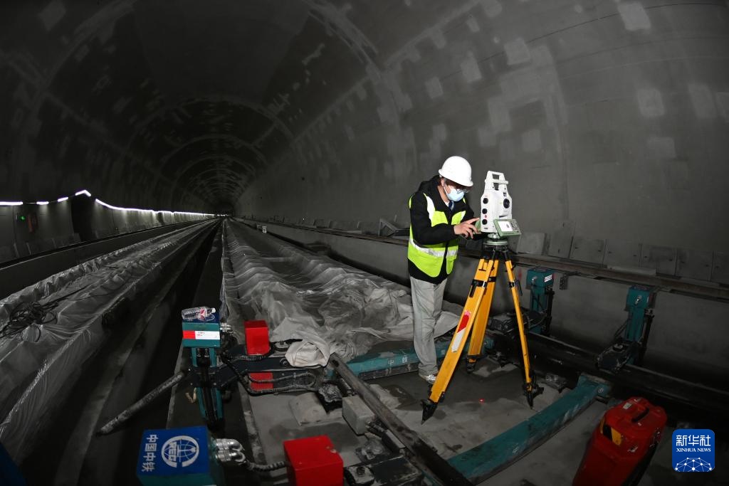 5月13日,在贯通的西康高铁秦岭九天山隧道内,施工技术人员在无砟轨道作业现场采集精调数据。