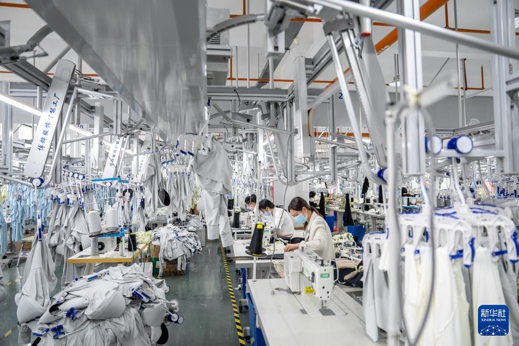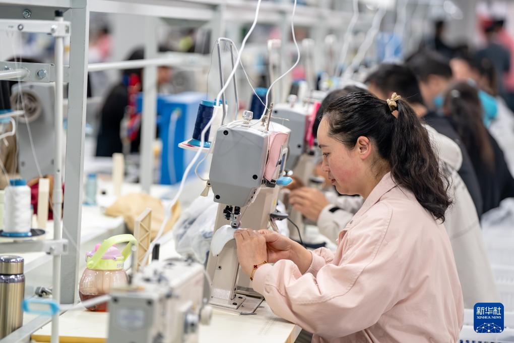 5月13日,云南省昭通市镇雄县居民在镇雄纺织服装产业园制作防晒服。