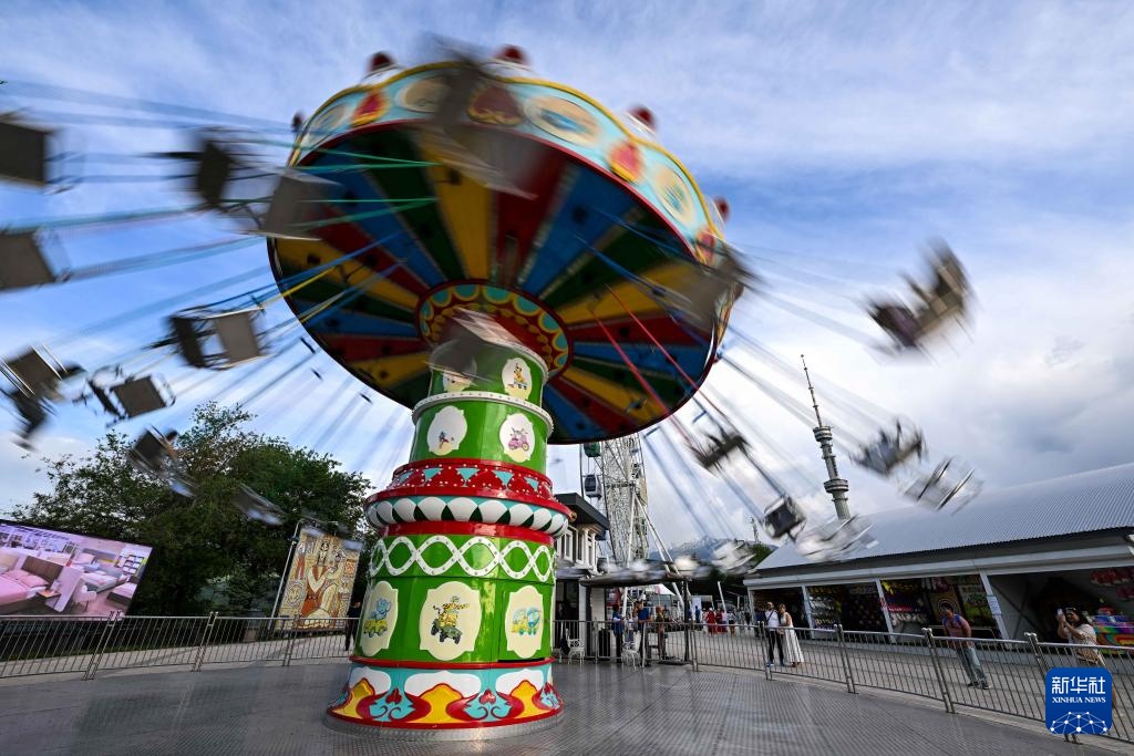 5月13日,人们在哈萨克斯坦阿拉木图的科克托别山体验游乐设施。