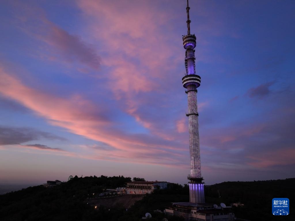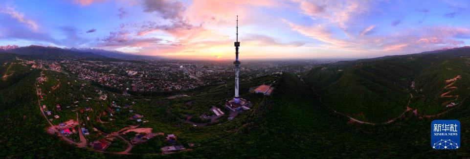 这是5月13日在哈萨克斯坦阿拉木图拍摄的日落时分的科克托别电视塔(无人机照片)。