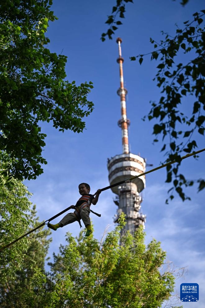 5月13日,一名男孩在哈萨克斯坦阿拉木图的科克托别山体验游乐设施。
