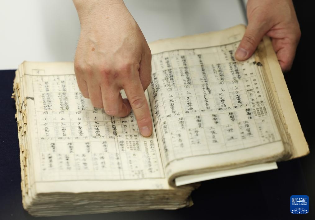 5月14日,在位于日本东京的日本国立公文书馆,工作人员展示侵华日军细菌战部队1644部队的留守名簿。