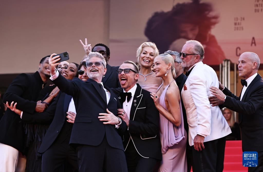 5月14日,在法国戛纳举行的第78届戛纳国际电影节上,美国导演克里斯托夫·迈考利(左五)等《碟中谍8:最终清算》主创人员在首映礼上自拍。