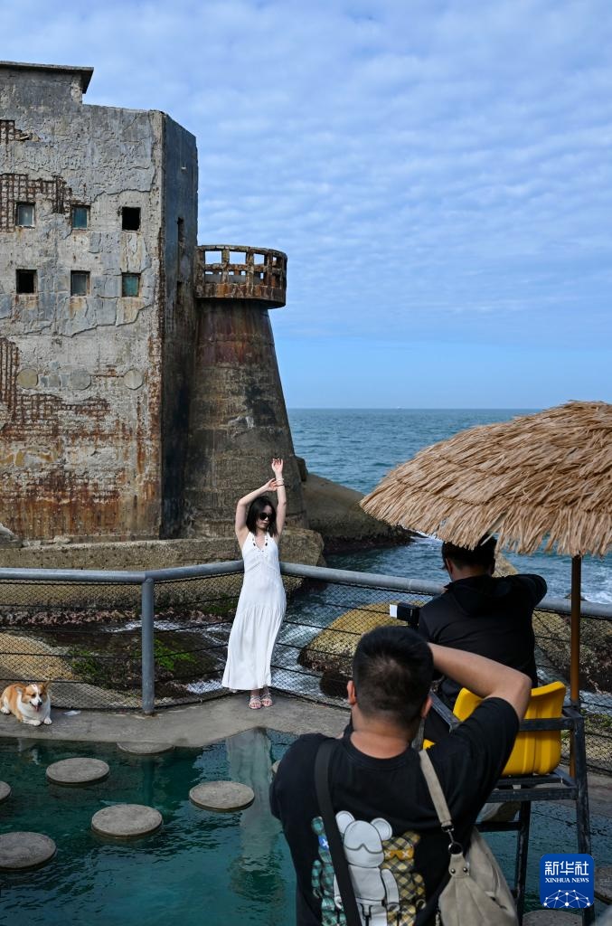 游客在广东汕尾红海湾“古堡咖啡店”旁拍照(5月14日摄)。