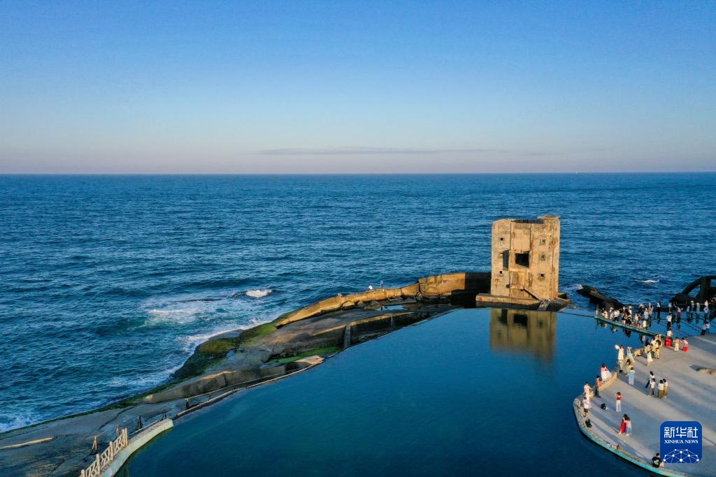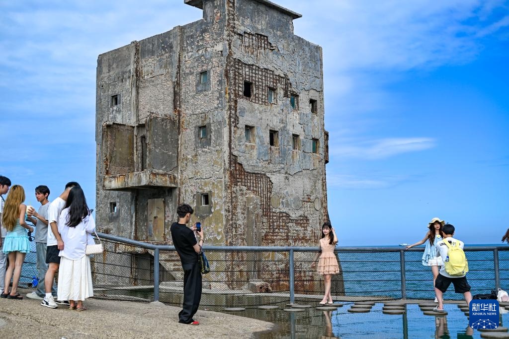 游客在广东汕尾红海湾“古堡咖啡店”旁海边打卡拍照(5月14日摄,无人机照片)。
