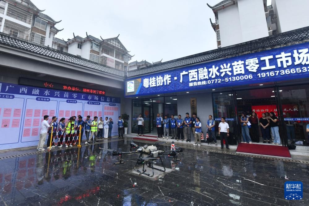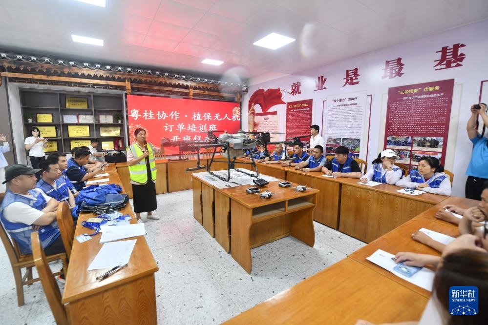 5月15日,在广西融水苗族自治县易地扶贫安置点苗美家园社区,群众在零工市场进行植保无人机培训。