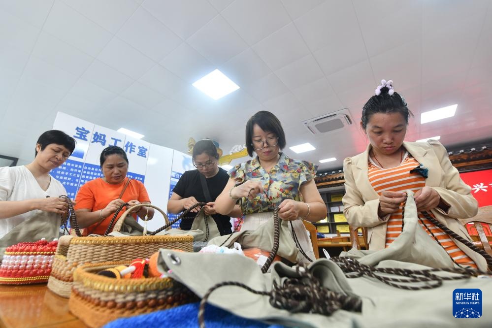5月15日,在广西融水苗族自治县易地扶贫安置点苗美家园社区,群众在零工市场制作手工艺品。