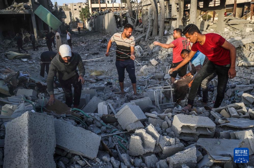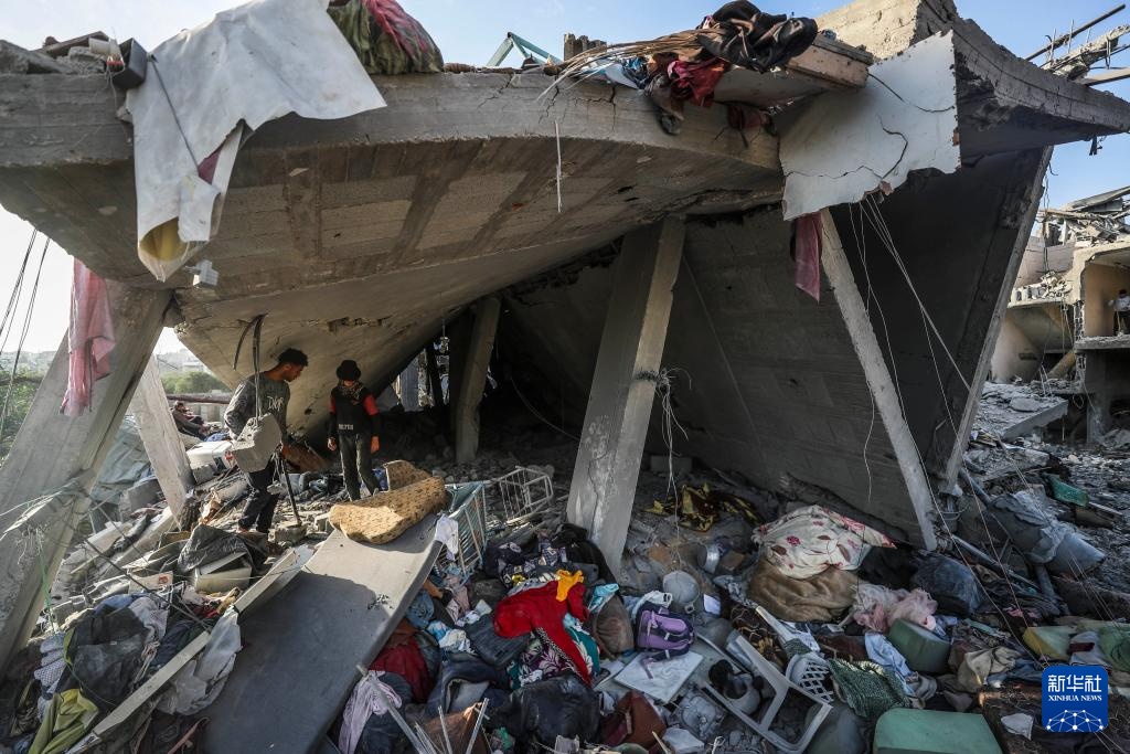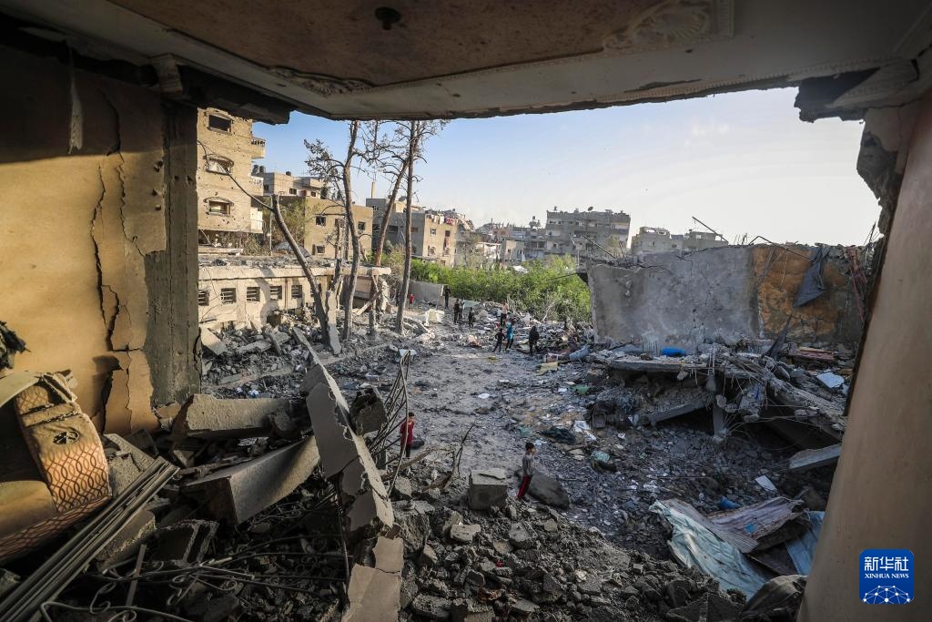 5月14日,在加沙地带北部杰巴利耶地区,巴勒斯坦人查看被以军轰炸后的废墟。