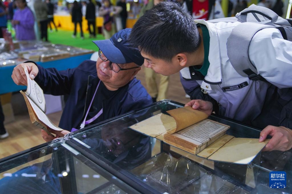 5月15日,参观者在博览会现场“旧书新知”展区参观古旧书籍。