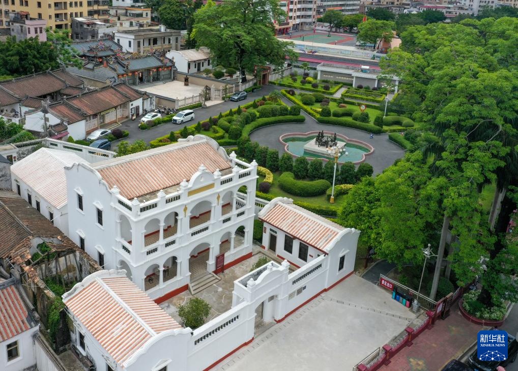 这是在广东汕尾拍摄的红宫(左)、红场(中)旧址和现为善美书院的海丰各界人民团体联合会成立旧址(右)(5月14日摄,无人机照片)。