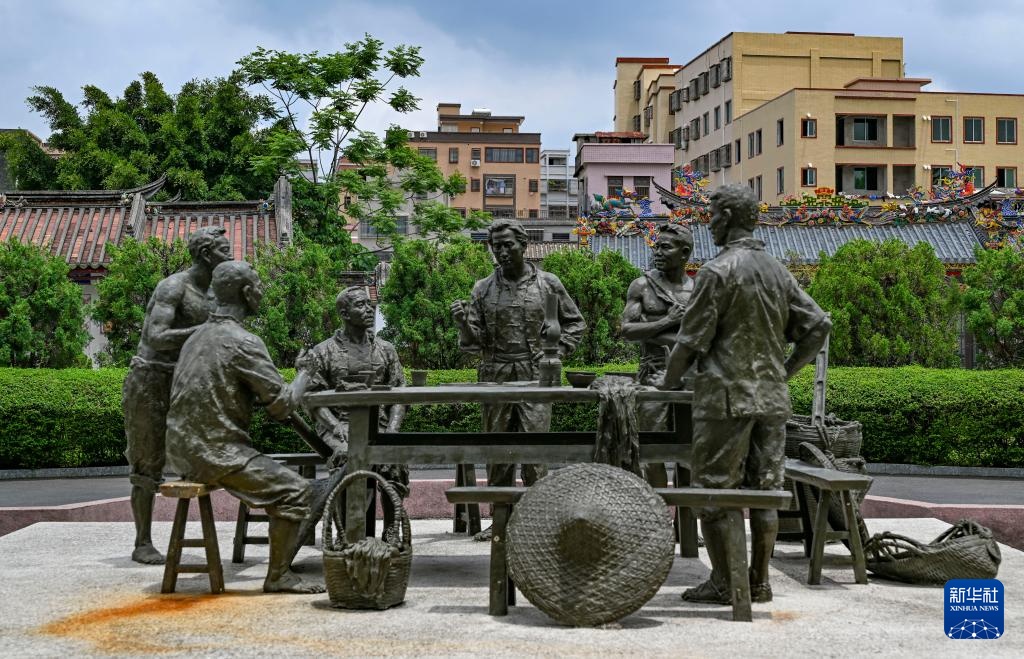这是广东汕尾得趣广场内的“六人农会”雕塑(5月14日摄)。该雕塑反映了1922年7月29日彭湃同志将几名志同道合的青年农民请到自己家里研究成立农民协会的场景。