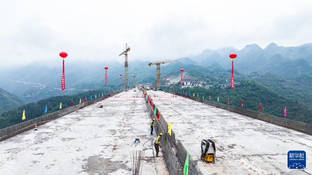 5月15日,工人在纳晴高速六枝特大桥上进行施工(无人机照片)。