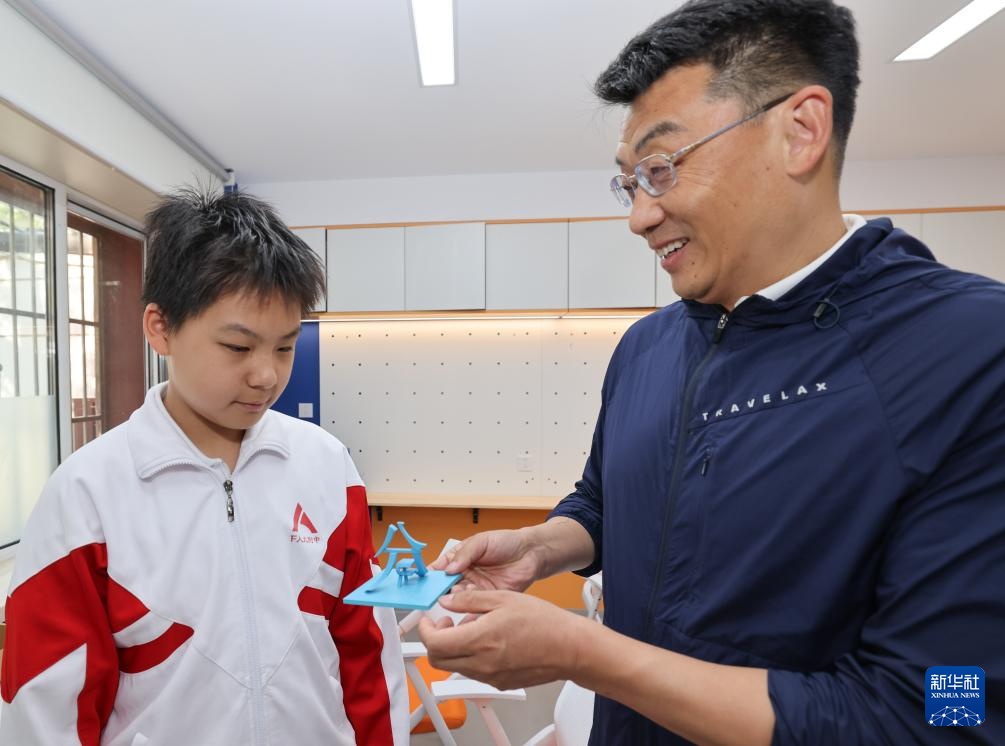 5月16日,在人大附中分校科创中心,校长徐利在查看学生用3D打印制作的“人分”标志模型。