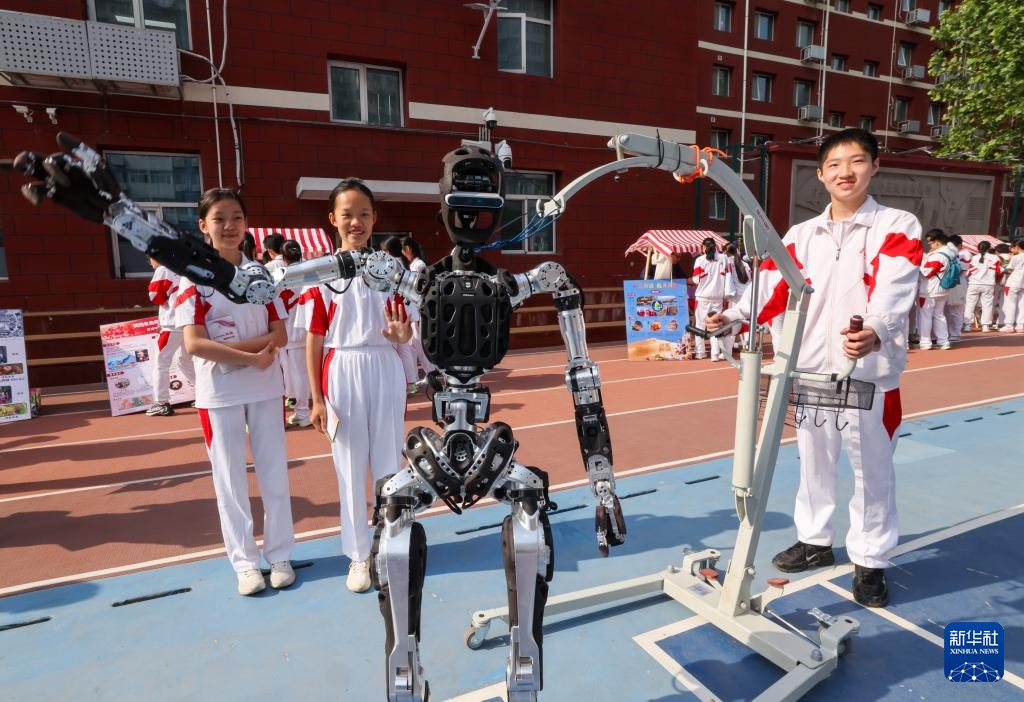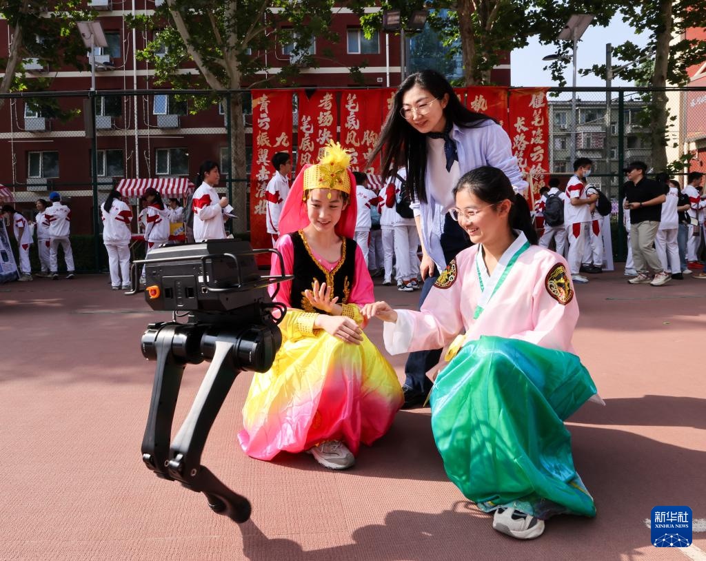 5月16日,在人大附中分校,师生在和机器人互动。