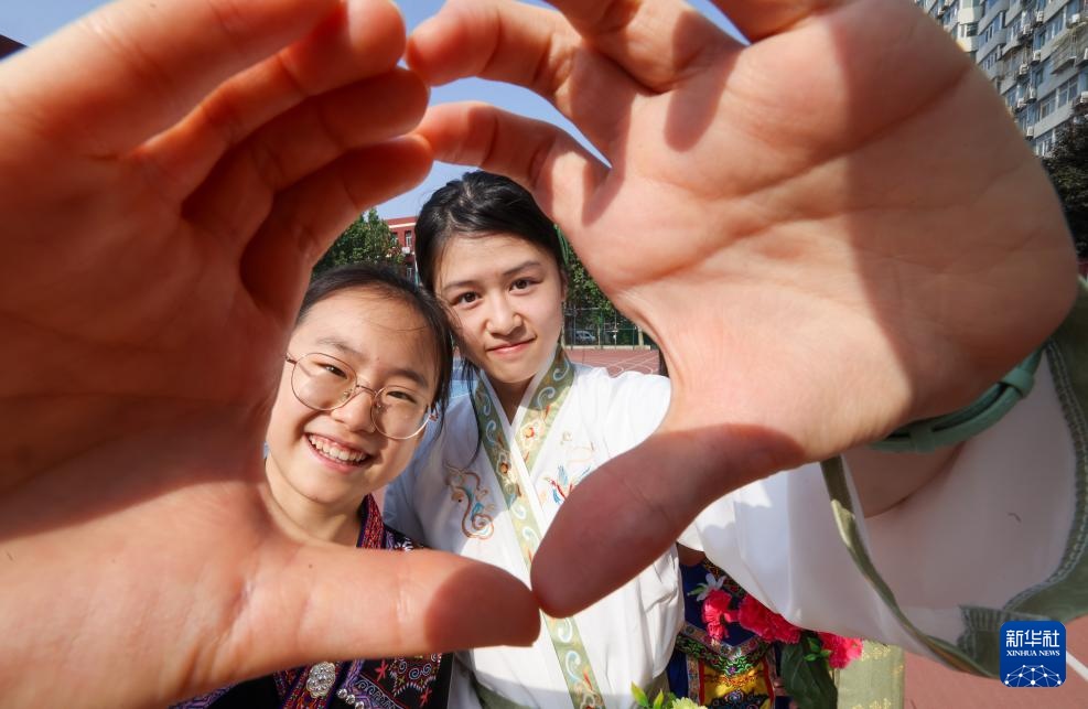 5月16日,在人大附中分校,两位身穿民族服装的学生作出"心"形手势。