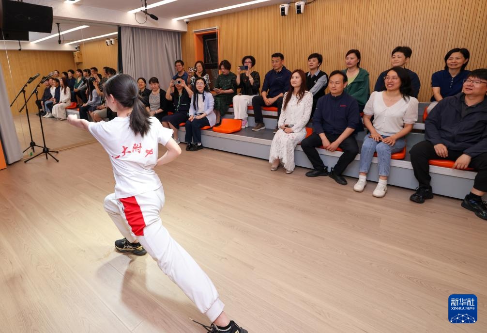 5月16日,在人大附中分校艺术中心,学生在表演武术操。