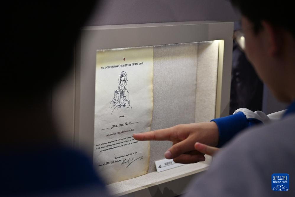 5月16日,参观者在天津医学博物馆参观南丁格尔奖证书。