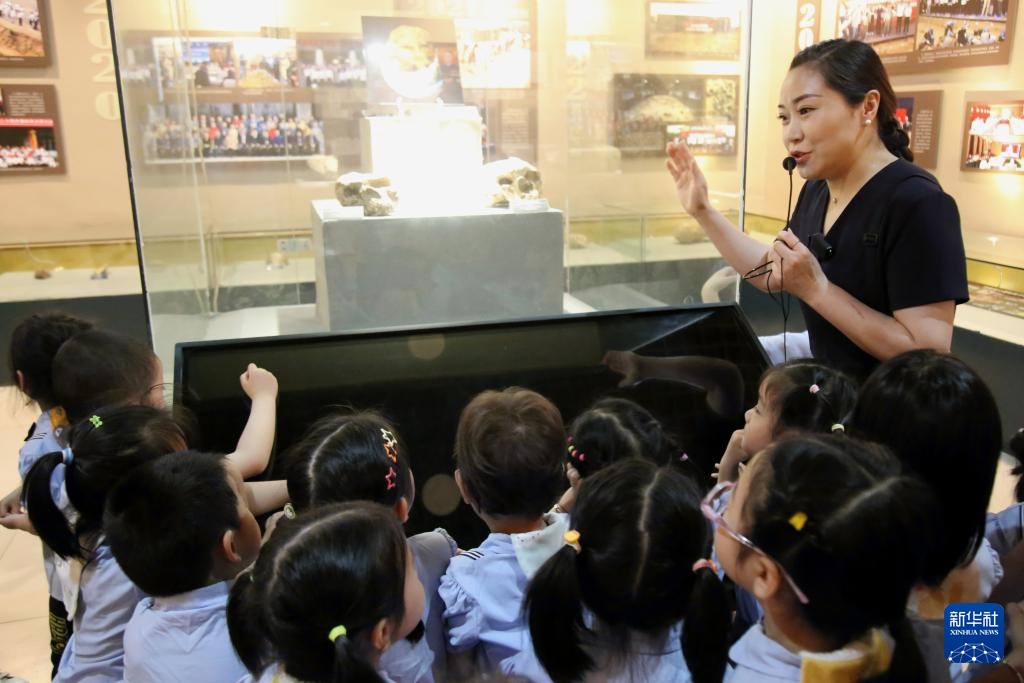 5月16日,讲解员在湖北省十堰市郧阳博物馆给幼儿园小朋友介绍展品。