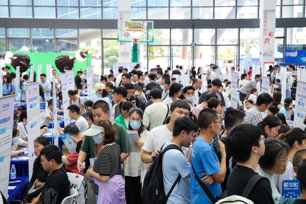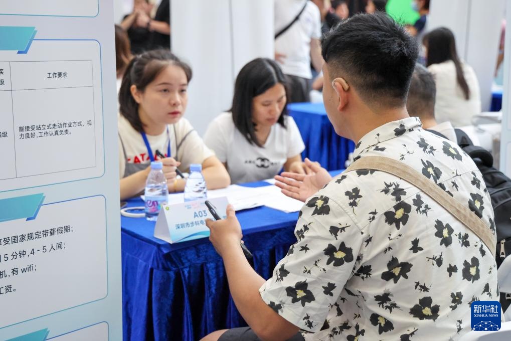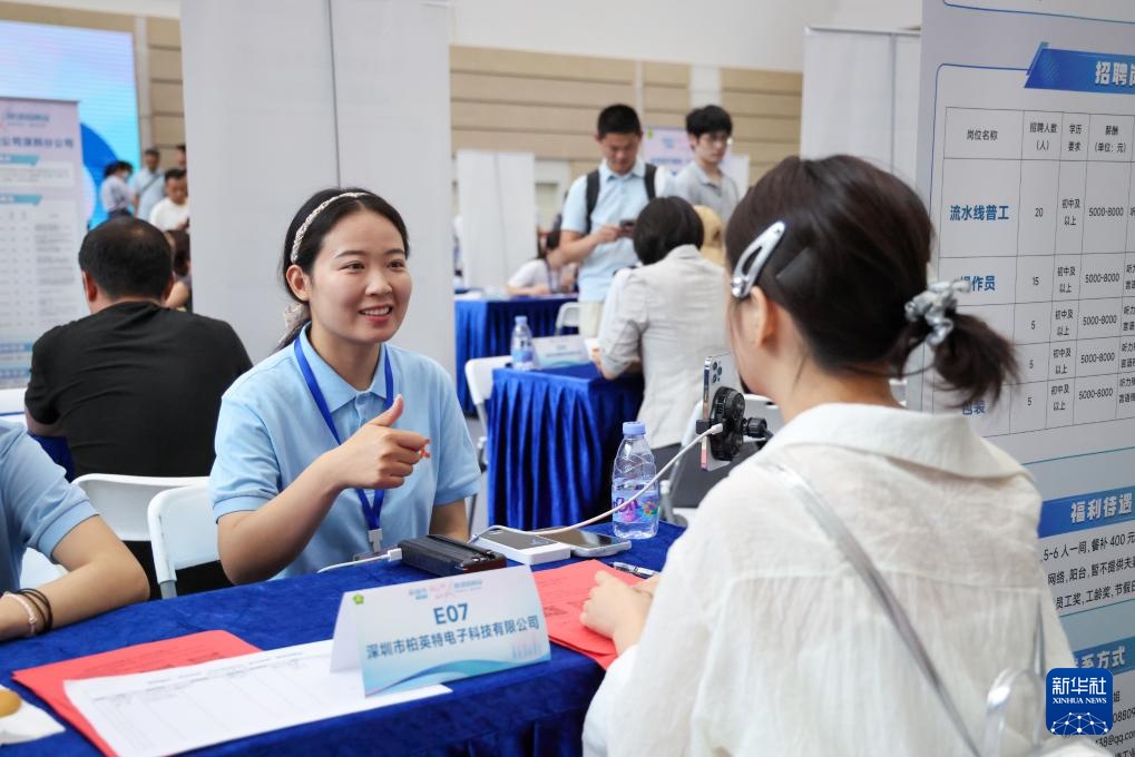 5月16日,在招聘会现场,求职者与企业招聘人员交流。