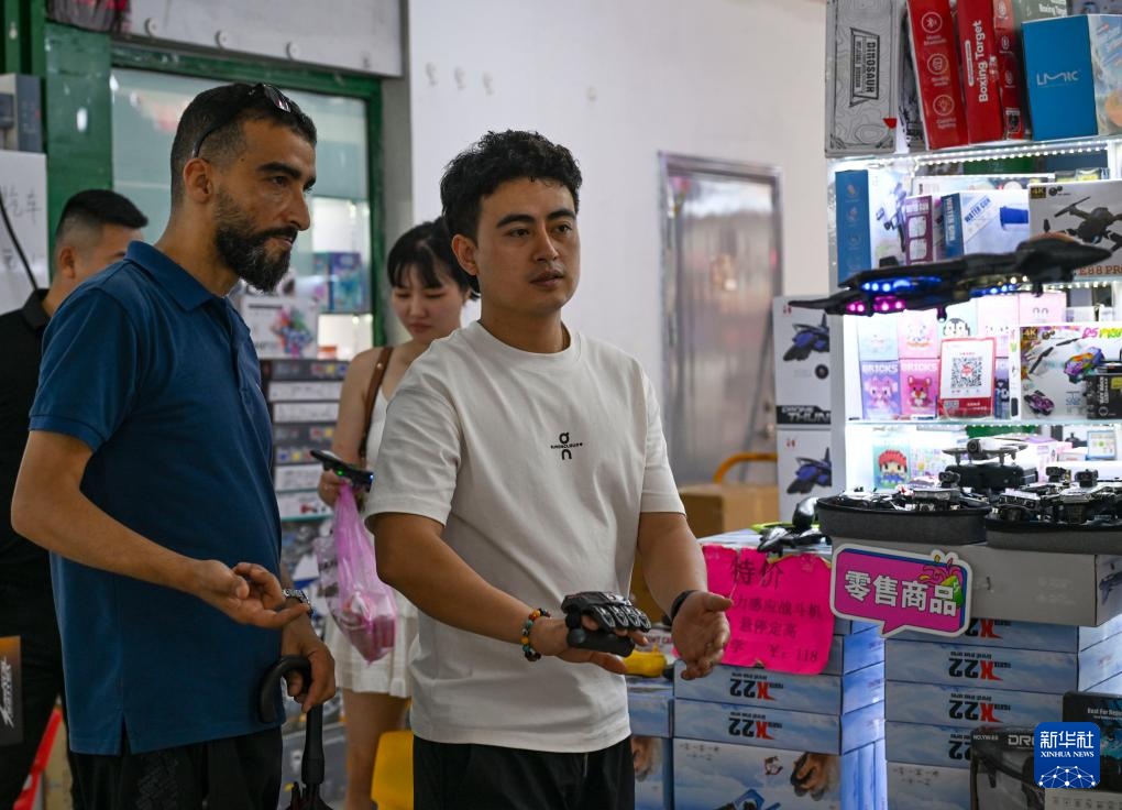 一家商户老板在用英语向外国客商展示介绍一款无人机玩具(5月16日摄)。