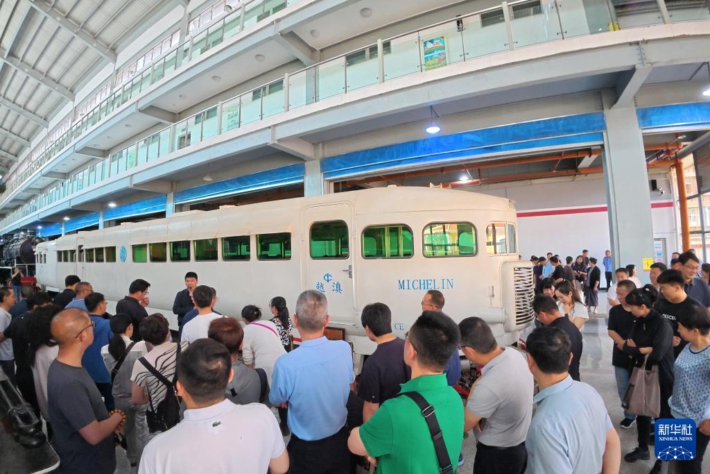 5月14日,参观者在云南铁路博物馆参观“米其林”内燃动车组。