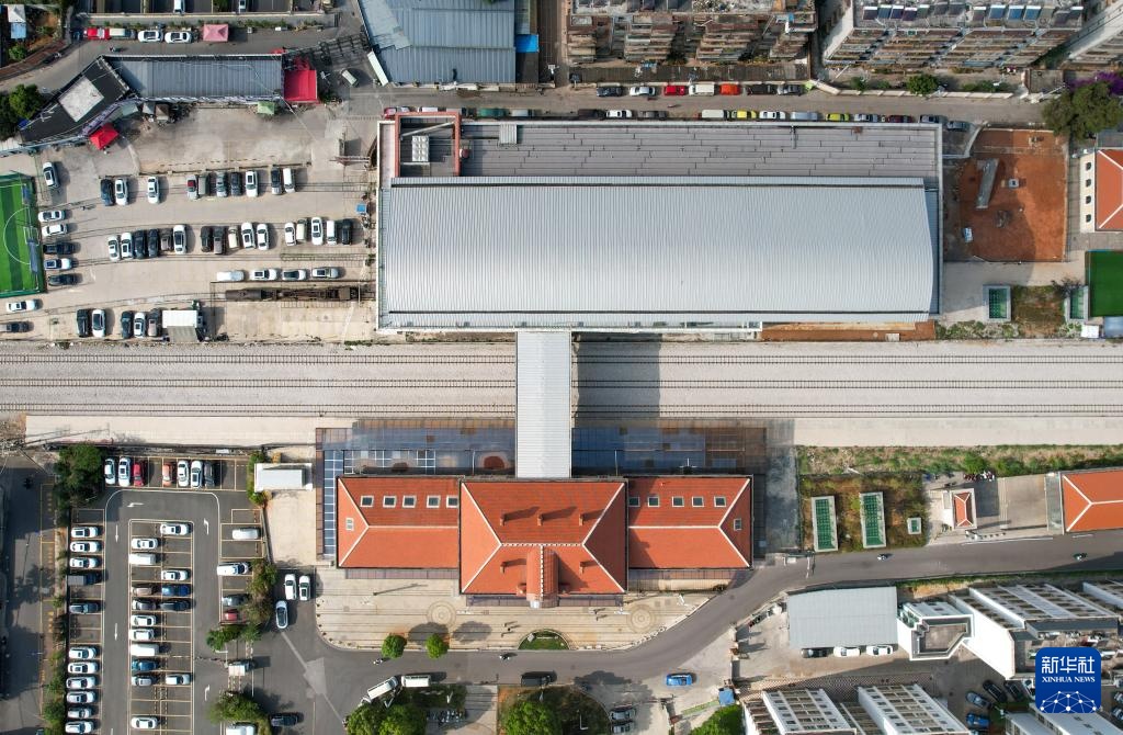 这是5月14日拍摄的云南铁路博物馆,南馆北馆通过廊桥贯通跨越昆明北火车站股道(无人机照片)。