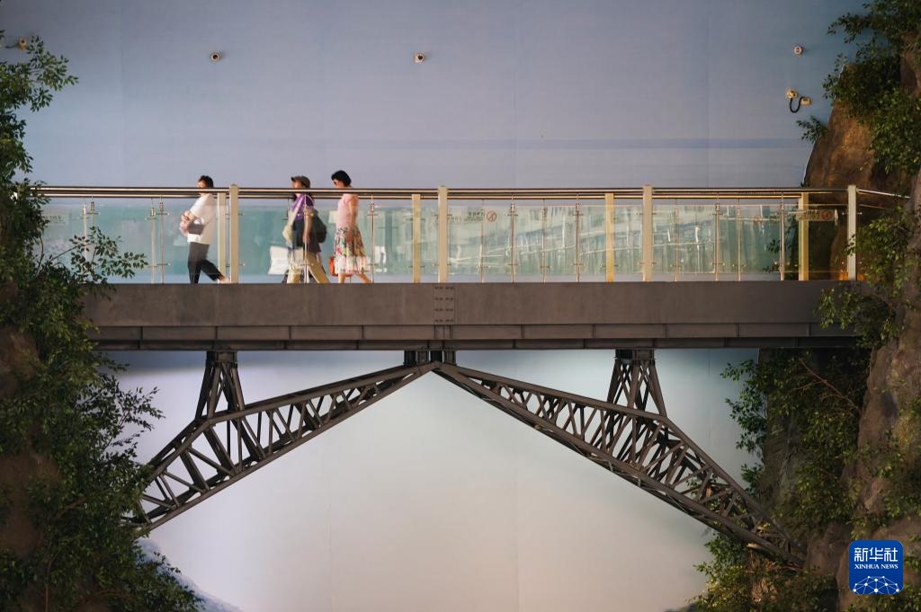 几名参观者走在云南铁路博物馆滇越铁路标志性工程“人字桥”模型上(5月14日摄)。