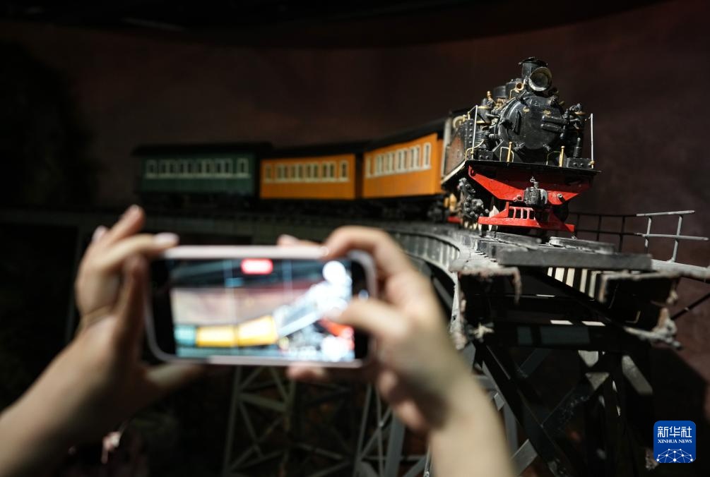 5月16日,一名参观者在云南铁路博物馆参观拍摄滇越铁路白寨大桥及米轨火车模型。