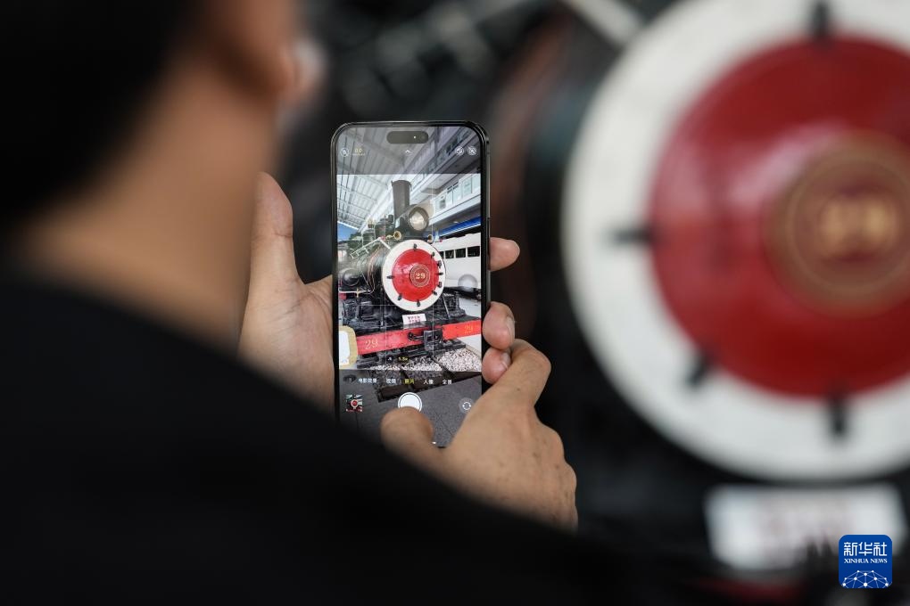 一名参观者在云南铁路博物馆拍摄SN型29号寸轨蒸汽机车(5月14日摄)。