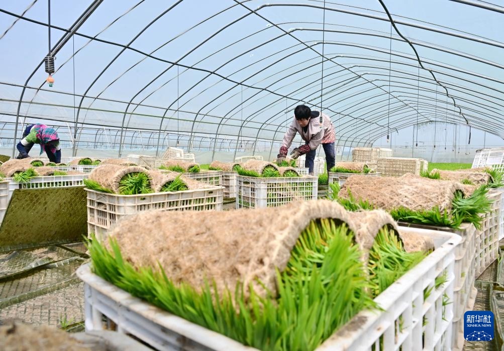 5月17日,河北省唐山市曹妃甸区第八农场的农民在水稻秧苗棚内起秧。